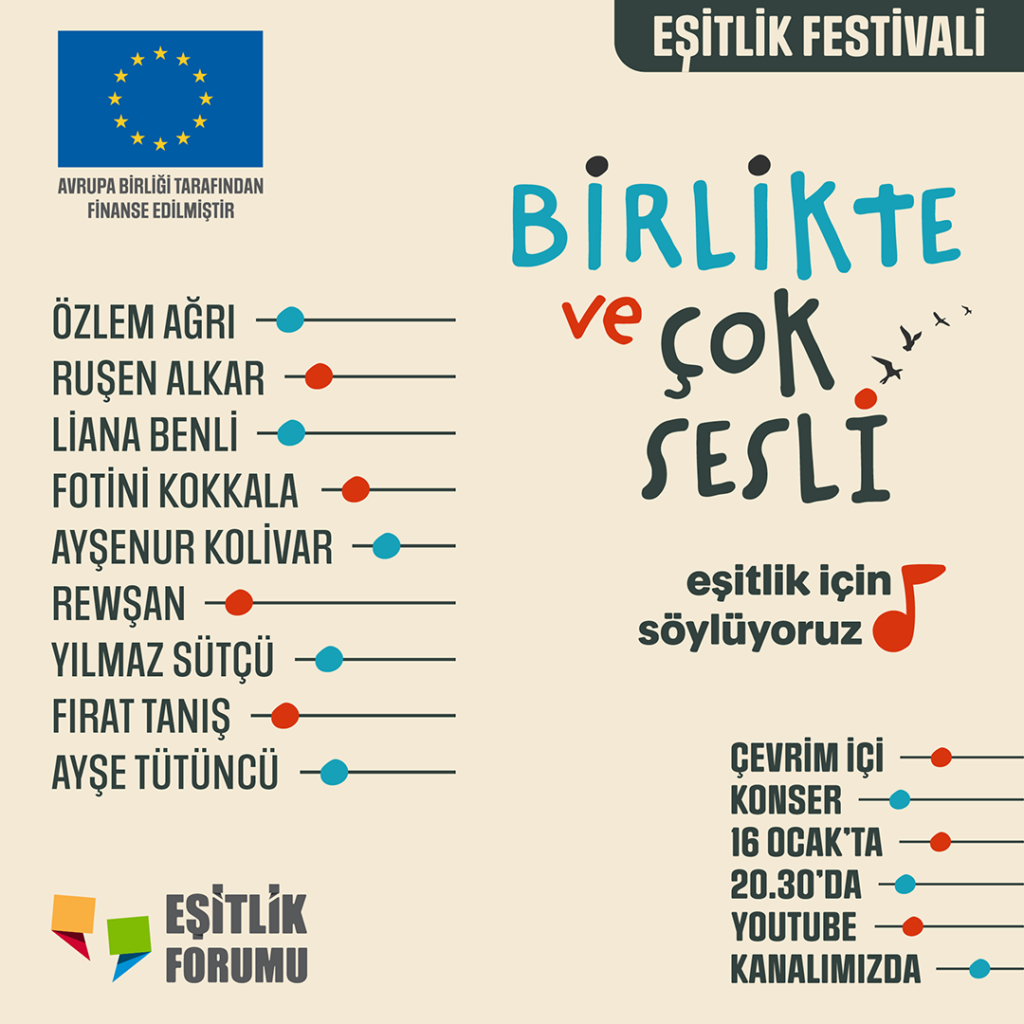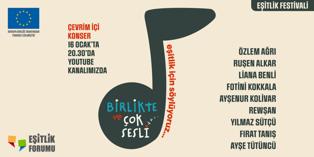 “Birlikte ve Çok Sesli” Çevrim İçi Konser, Avrupa Birliği Türkiye Delegasyonu tarafından desteklenen, Eşit Haklar İçin İzleme Derneği, Sosyal Kültürel Yaşamı Geliştirme Derneği ve Karadeniz Kadın Dayanışma Derneği tarafından yürütülen “İnsan Haklarına Eşit Erişim Kampanyası Projesi” kapsamındaki “Eşitlik Festivali”nin Ayrımcılık Temalı Film Günleri ertesindeki final etkinliği olarak düzenleniyor. 16 Ocak 2021 Cumartesi günü saat 20.30’da çevrim içi konser yayınına Eşitlik Forumu sosyal medya hesaplarından ve YouTube kanalından erişilebilecek.